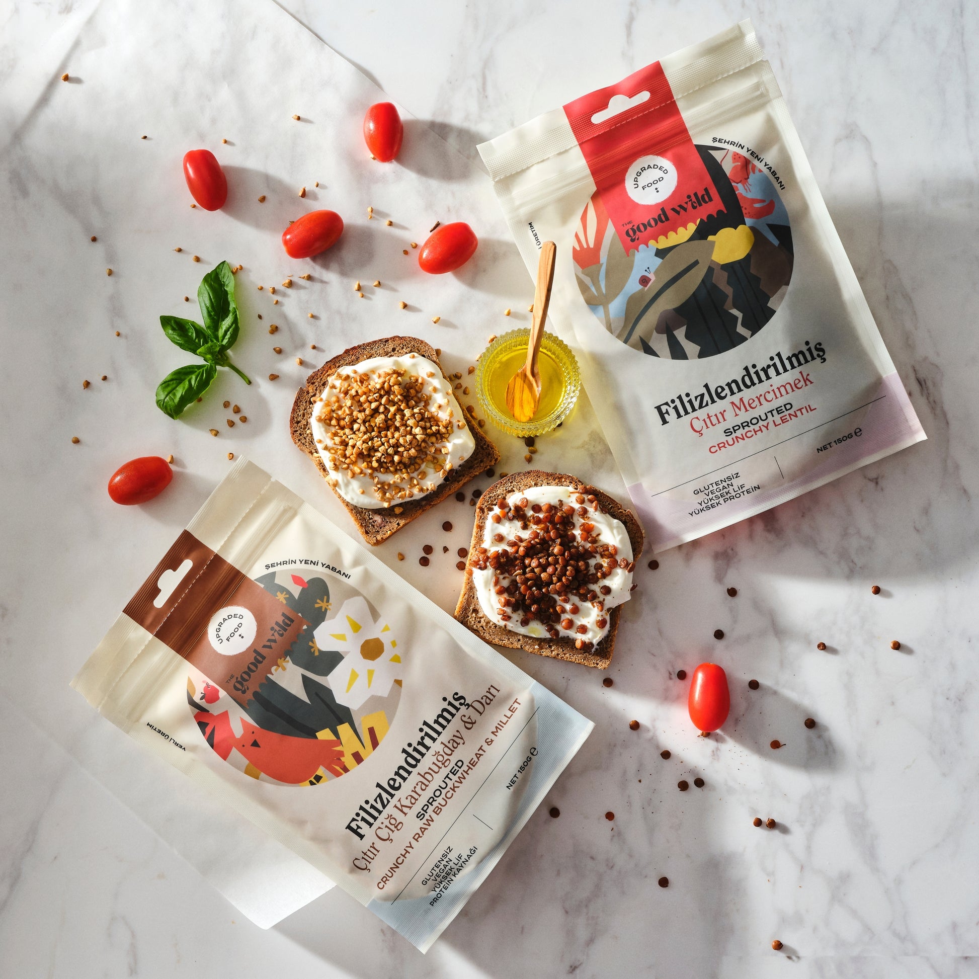 Filizlendirilmiş ve baharatlarla fırınlanmış çıtır çiğ karabuğday ve darı, pratik kullanım alanlarıyla mutfakta elinin hemen altında!