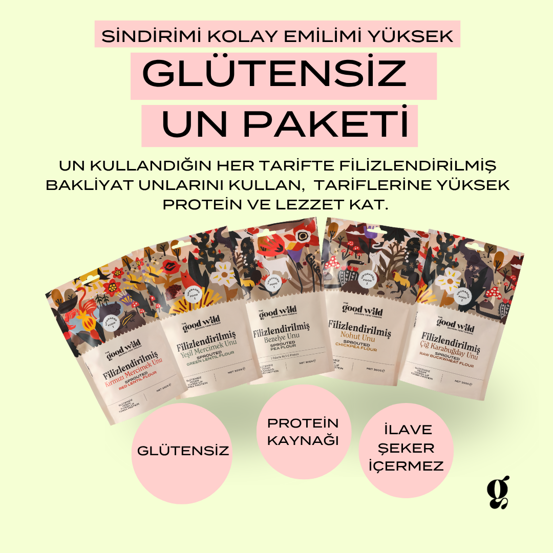 - Sağlıklı beslenme alışkanlıkları: Glütensiz bu unlar, filizlendirilmiş bakliyatlardan üretilmiş olup, yüksek lif içeriği sayesinde sindirim sistemini destekler.